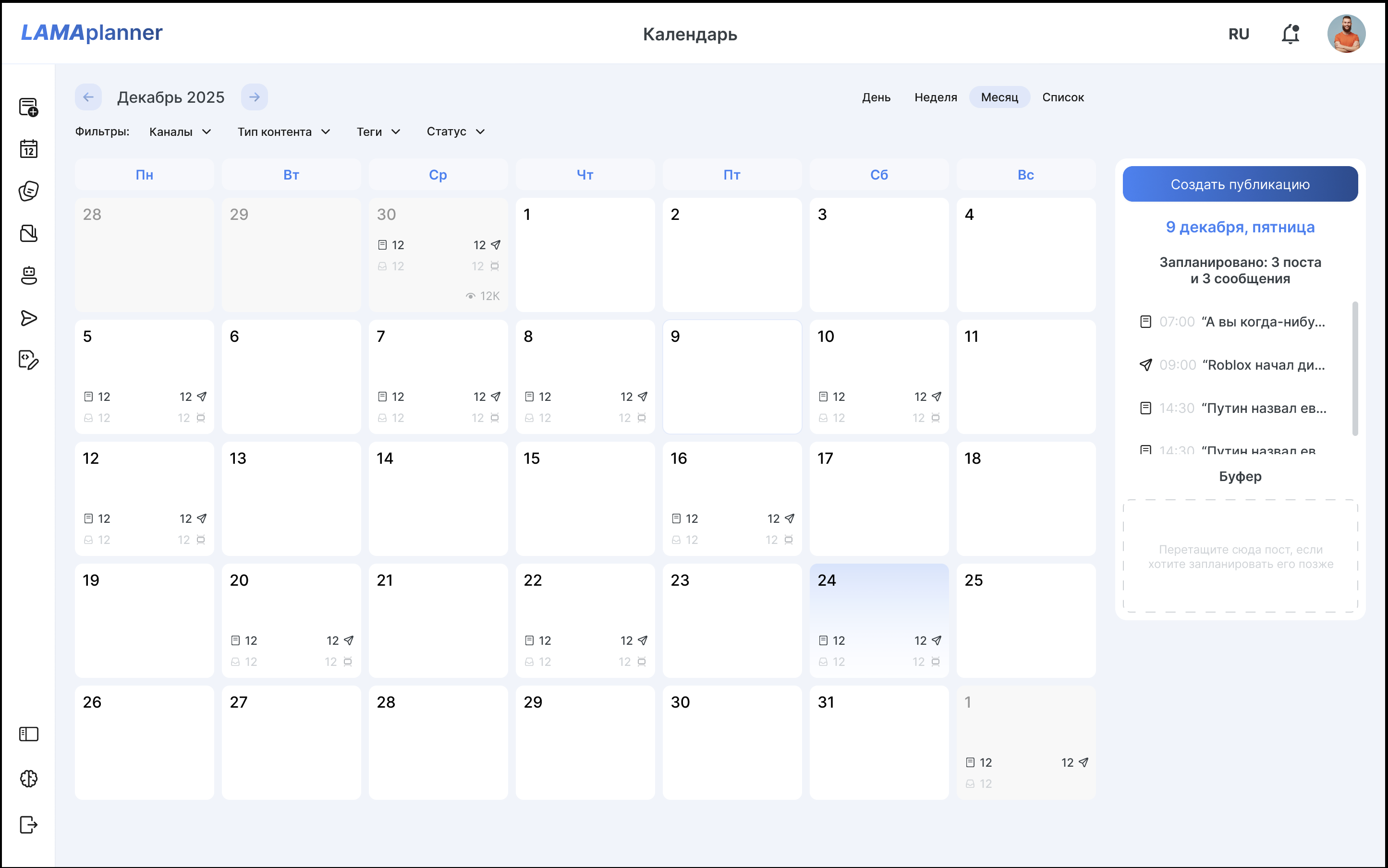 Добавьте канал или группу один раз — и дальше работайте с ними в одном интерфейсе. В списке видно ключевую информацию, а переключение между проектами занимает секунды.